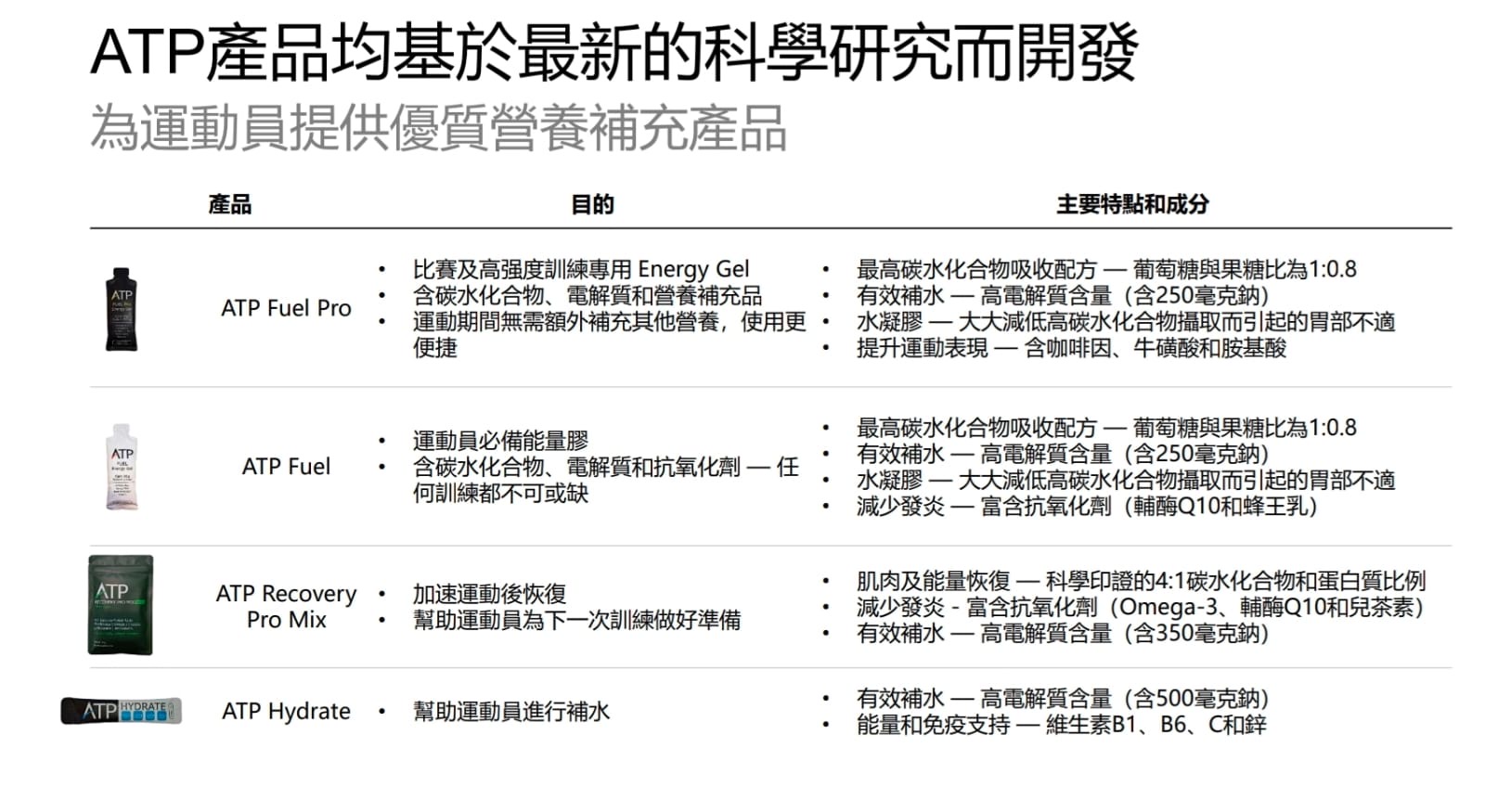- 麥芽糊精和果糖以 1:0.8 的比例製成 30 克速效碳水化合物,確保最大吸收量。