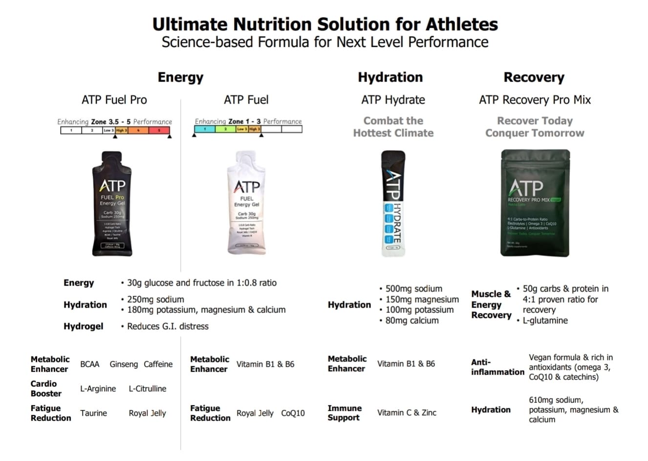 - 水、麥芽糊精、果糖、檸檬酸鈉、氯化鉀、乳酸鈣、檸檬酸鎂、蜂王漿、鹽、維生素 B1 (硫胺素)、維生素 B6 (Pyridoxine HCl)、結倫膠、檸檬酸、輔酵素 Q10、天然葡萄柚香料