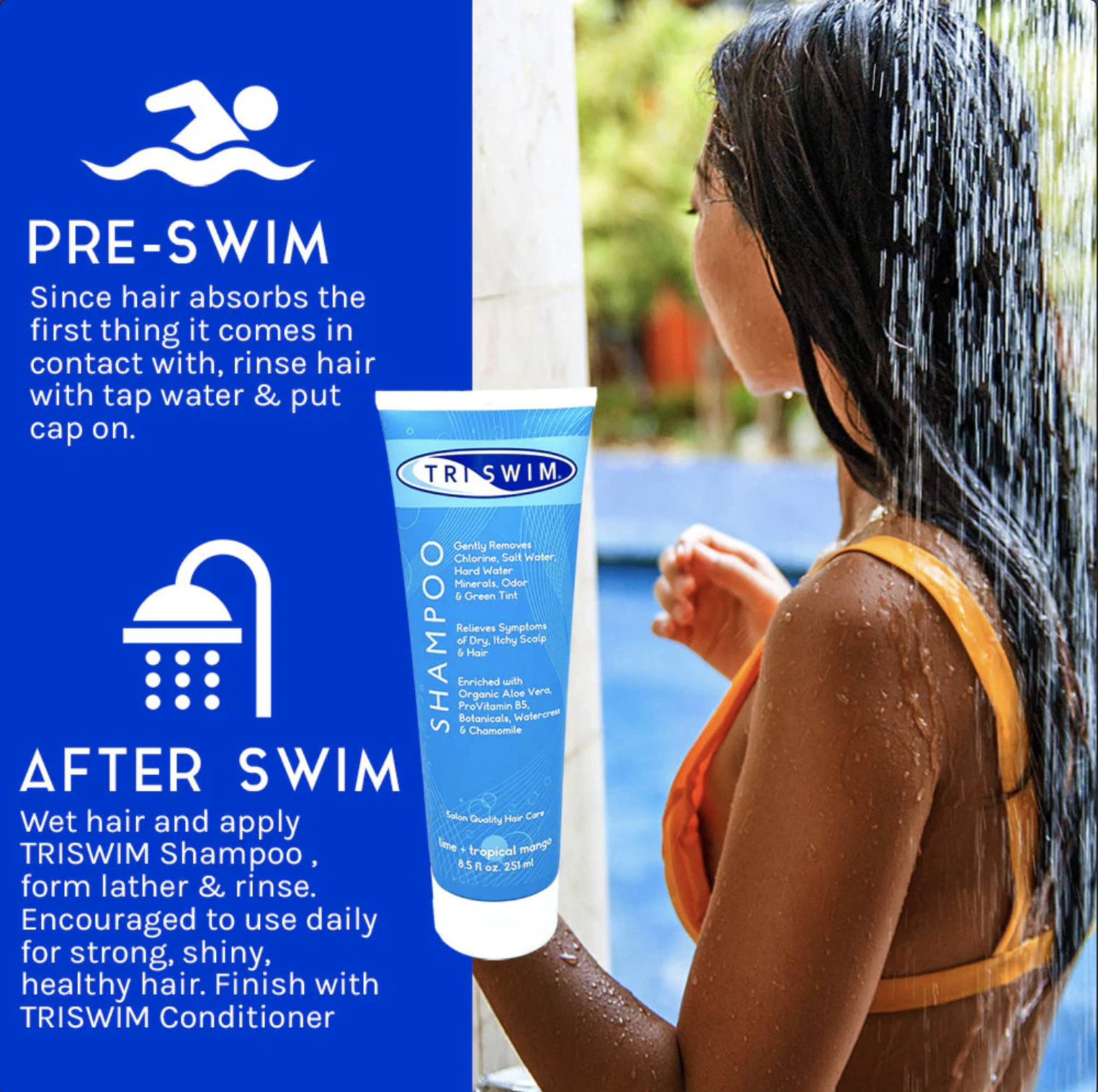 • 使用 TRISWIM 洗髮水可中和並去除頭髮中的氯、溴、鹽水、硬水礦物質和其他化學異味;我們的洗髮水可以治療並舒緩乾燥的頭髮,讓您的頭髮保持清爽和健康
